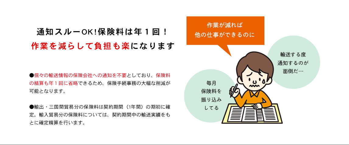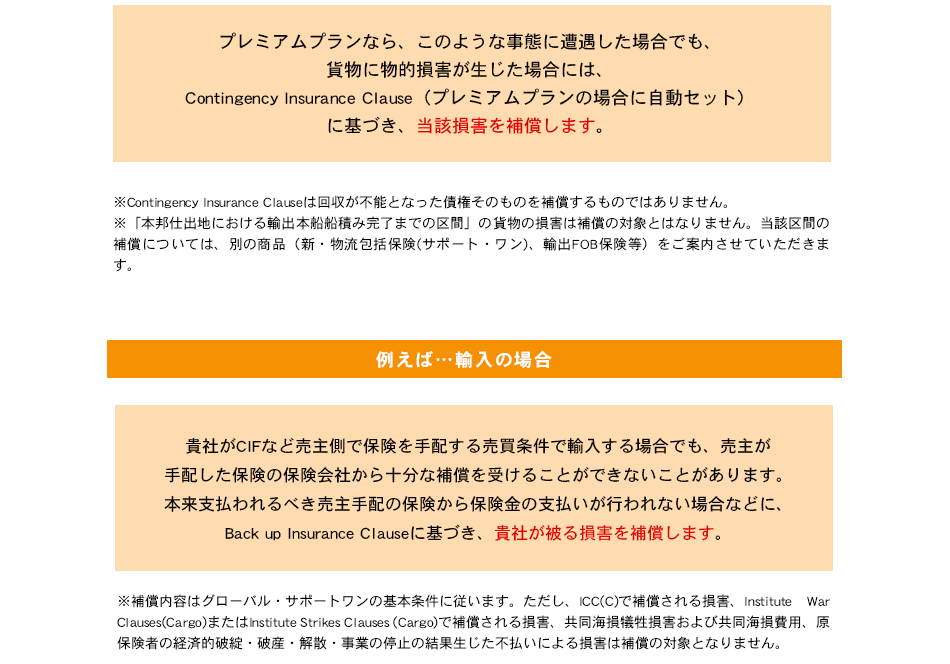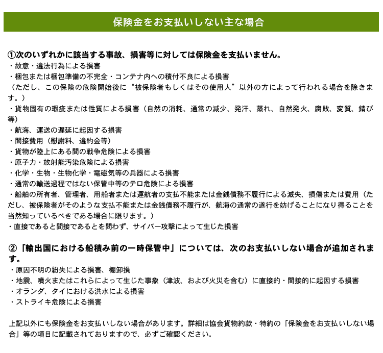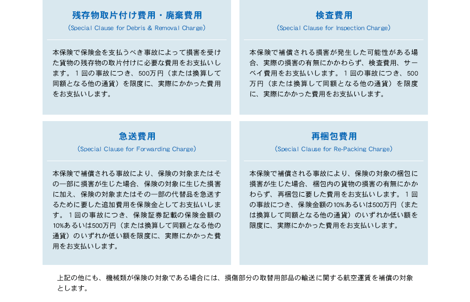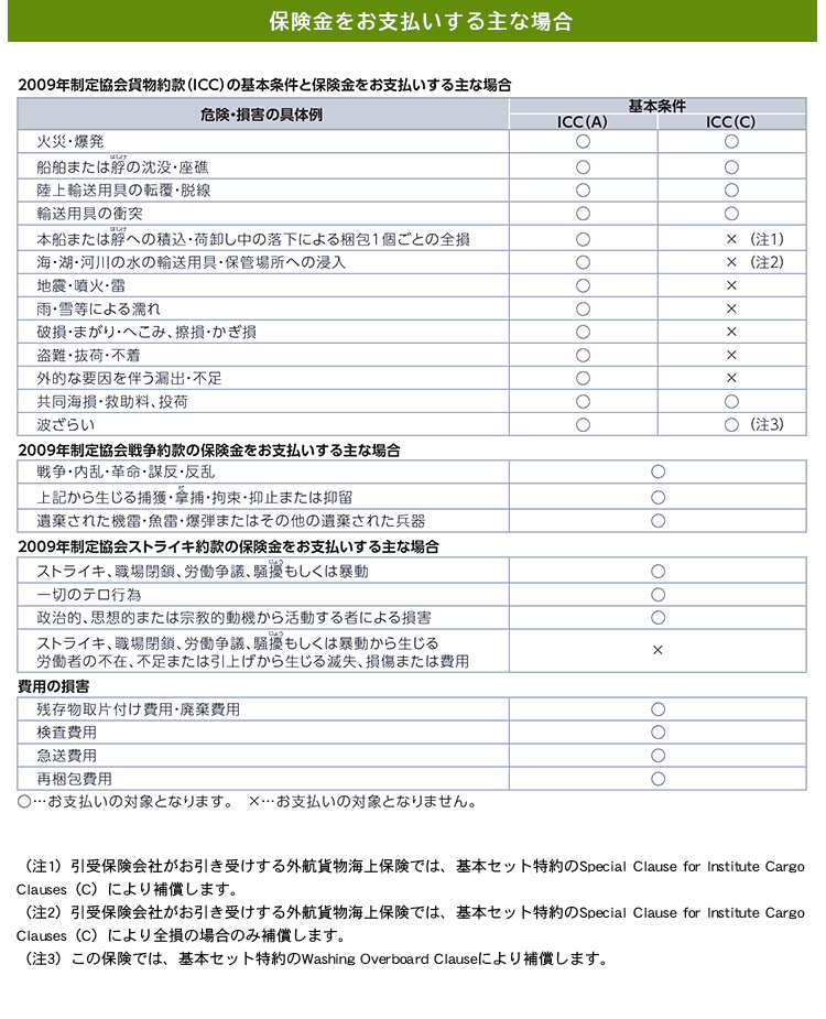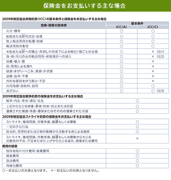 (注2)引受保険会社がお引き受けする外航貨物海上保険では、基本セット特約のSpecial Clause for Institute Cargo Clauses(C)により全損の場合のみ補償します。